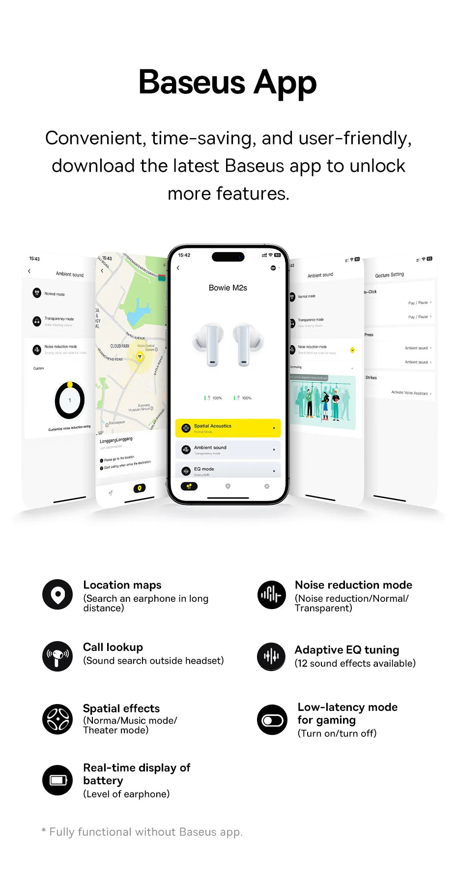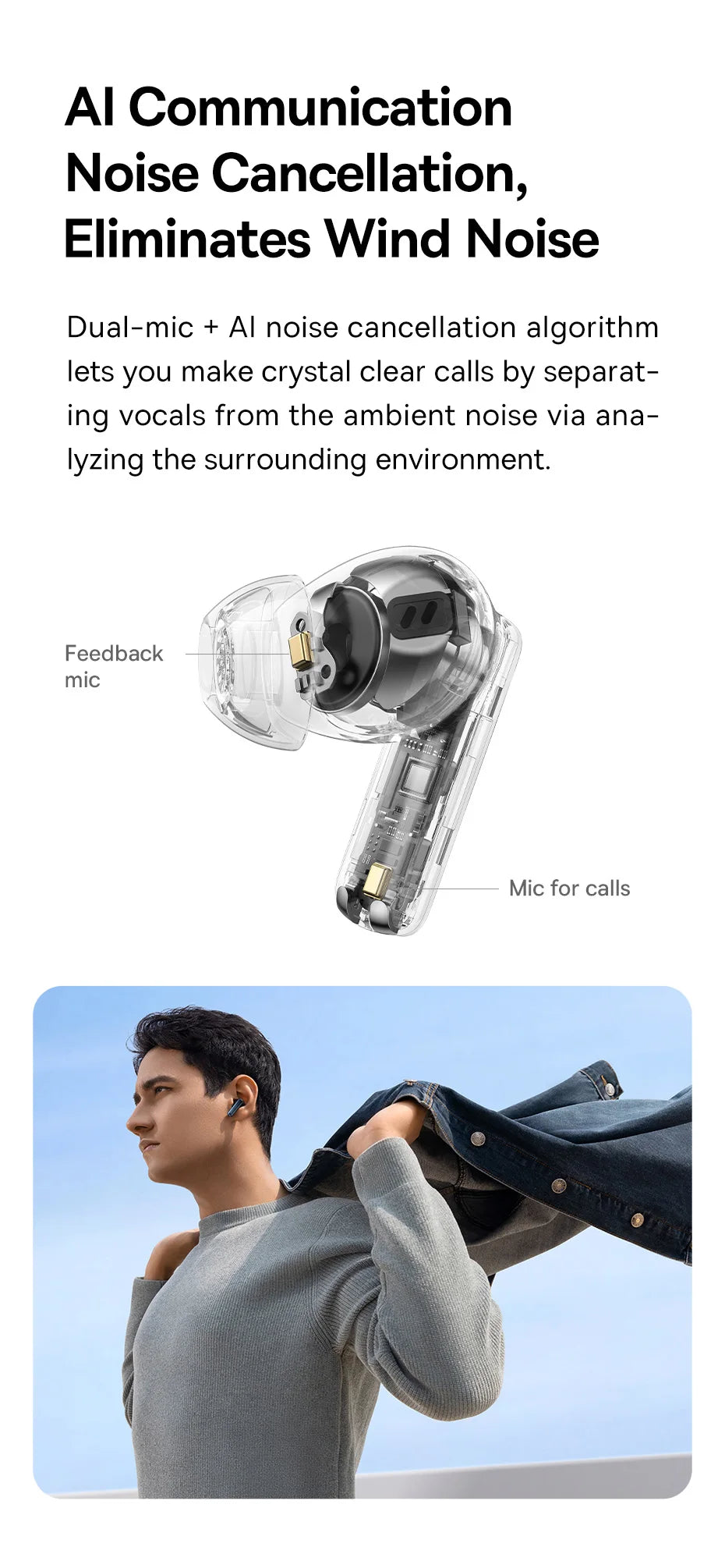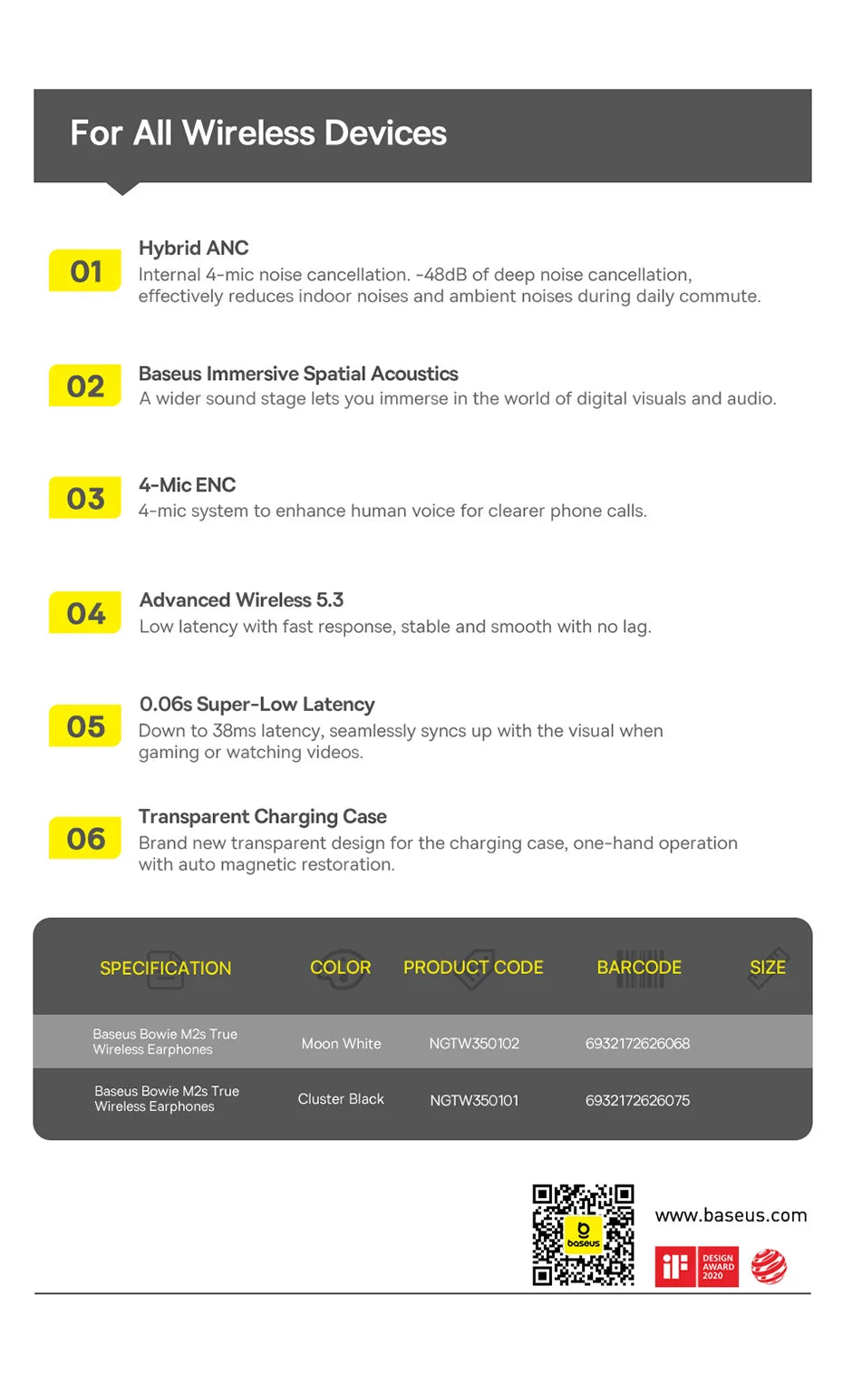 Baseus Bowie M2s -48dB ANC Безжични Bluetooth 5.3 3D пространствено аудио слушалки HiFi качество 0.038" ниска латентност слушалки