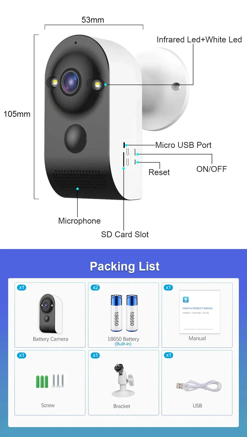 V380 PRO Мини Камера Безжична WiFi Външна Вградена Батерия PIR Видео Монитор за Засичане на Човешки Същества 5MP Домашни Камери за Видеонаблюдение